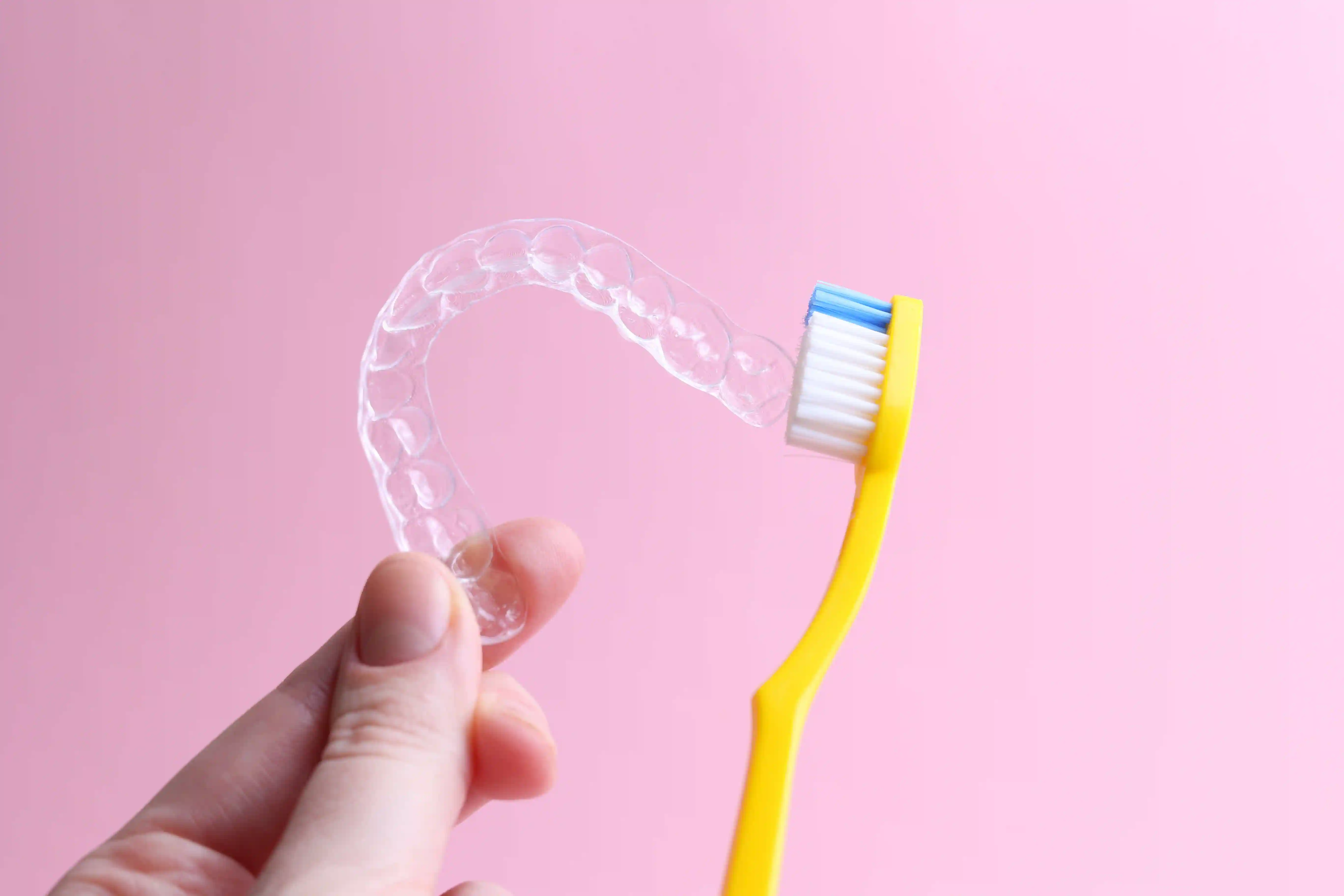 Rinse with lukewarm water and brush gently with a soft toothbrush. Use Invisalign® cleaning crystals or a mild, clear soap—never hot water, as it can permanently warp the plastic.